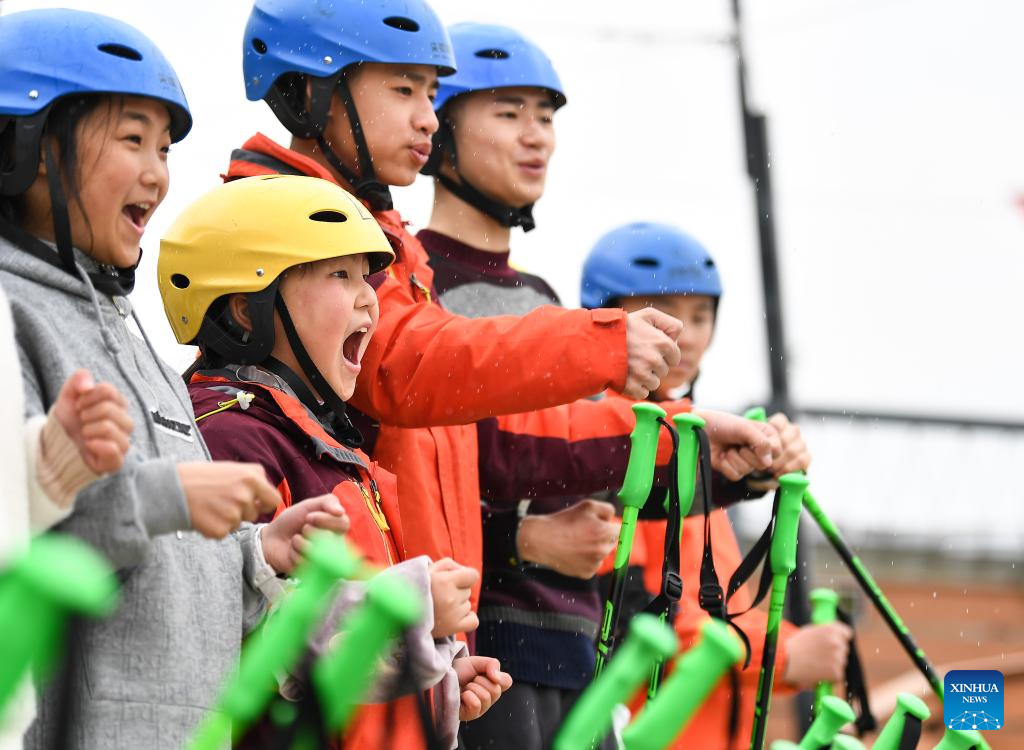 Member of the "Dieyun" ski team Wang Xinyue shares her experience in skiing with classmates at the special education school in Xindu District of Chengdu, southwest China's Sichuan Province, Feb. 25, 2022. When seeing the boys and girls skiing down the slope, no one will realize they are anything different from other ski-loving youngsters until noticing their coach communicating with them mainly through writing and gesturing.