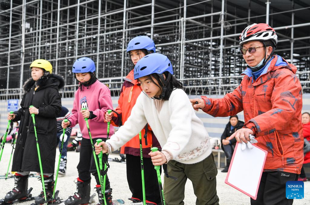 Coach Cao Jian (1st L) instructs as members of the "Dieyun" ski team learn at a dry ski training facility in Xindu District of Chengdu, southwest China's Sichuan Province, Feb. 25, 2022. When seeing the boys and girls skiing down the slope, no one will realize they are anything different from other ski-loving youngsters until noticing their coach communicating with them mainly through writing and gesturing.