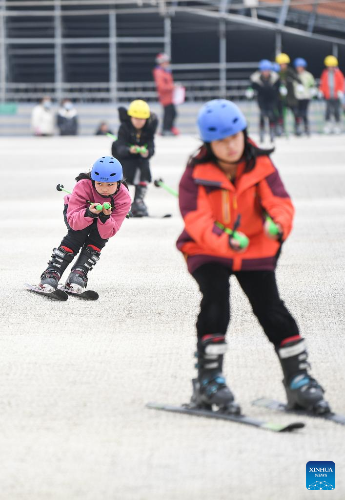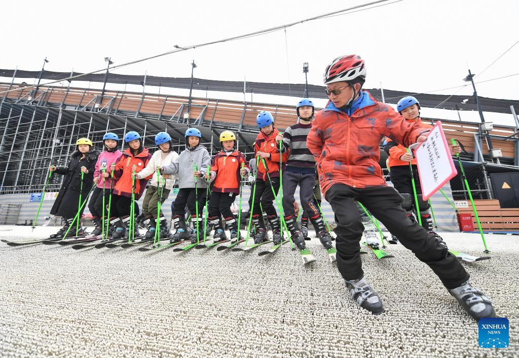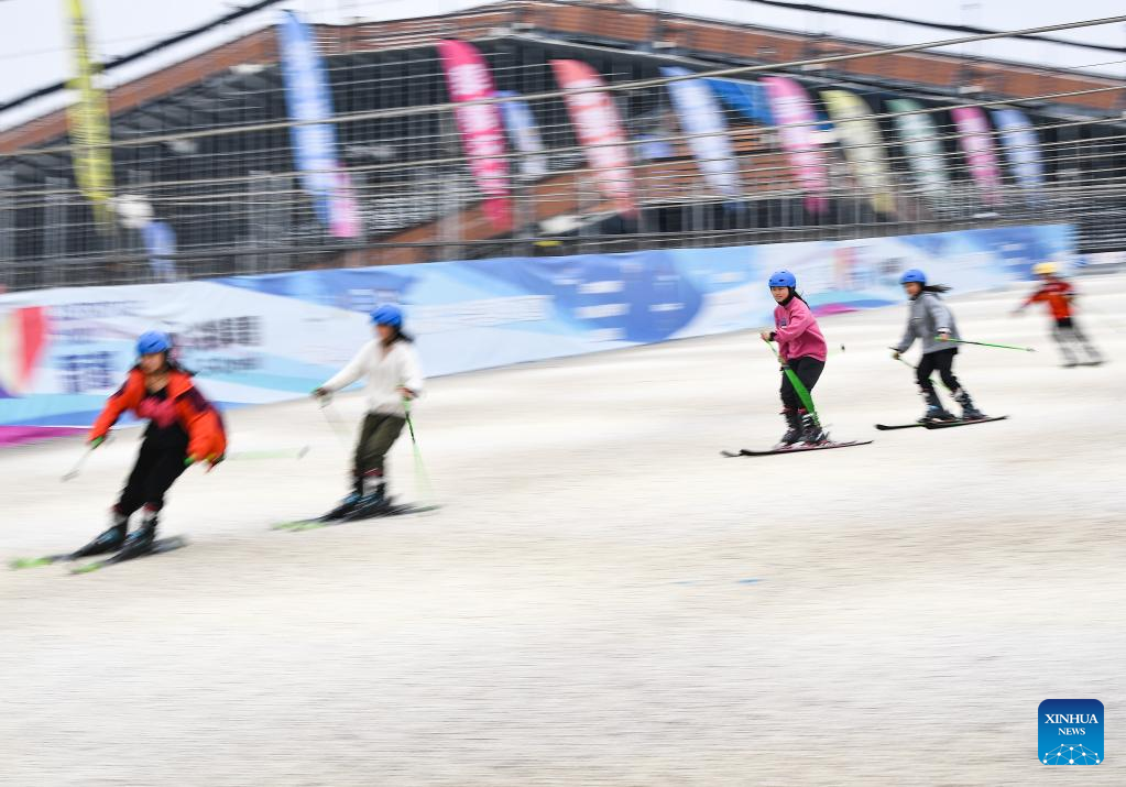 Members of the "Dieyun" ski team practice in a training session at a dry ski training facility in Xindu District of Chengdu, southwest China's Sichuan Province, Feb. 25, 2022. When seeing the boys and girls skiing down the slope, no one will realize they are anything different from other ski-loving youngsters until noticing their coach communicating with them mainly through writing and gesturing.