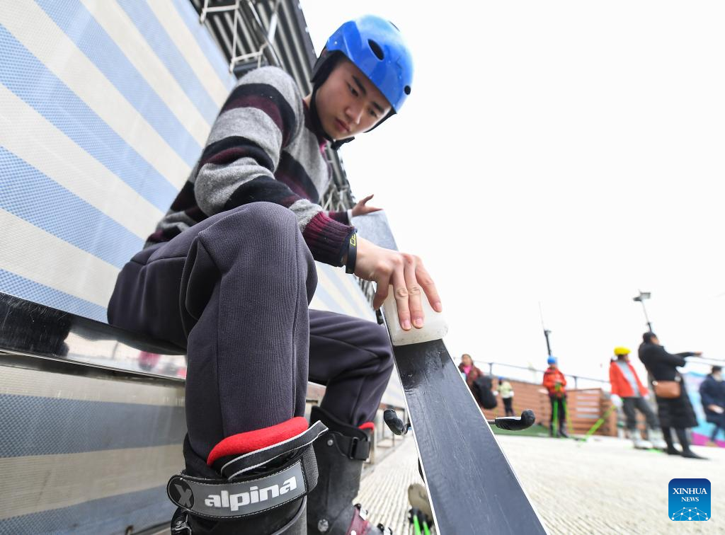 Member of the "Dieyun" ski team Hu Haitao waxes his snowboard before a training session at a dry ski training facility in Xindu District of Chengdu, southwest China's Sichuan Province, Feb. 25, 2022. When seeing the boys and girls skiing down the slope, no one will realize they are anything different from other ski-loving youngsters until noticing their coach communicating with them mainly through writing and gesturing.
