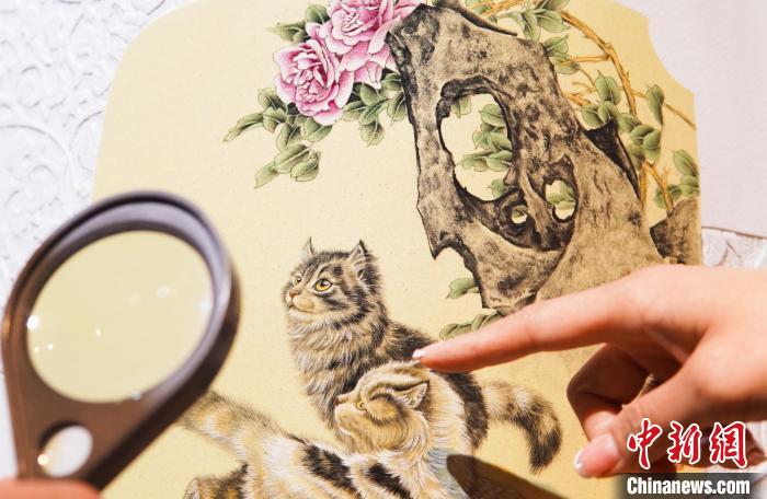 Photo shows a piece of ceramic work created by Sun Dena featuring vivid cats. (Chinanews.com/Wang Haoyang)