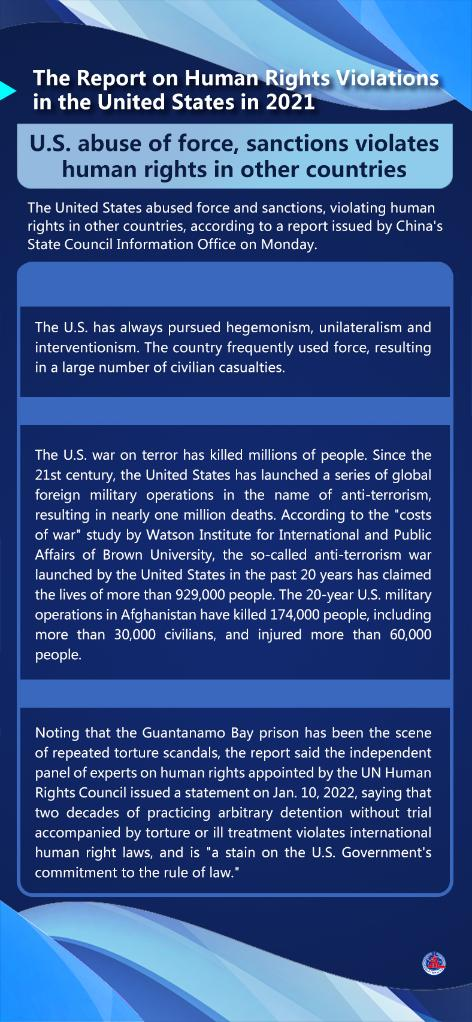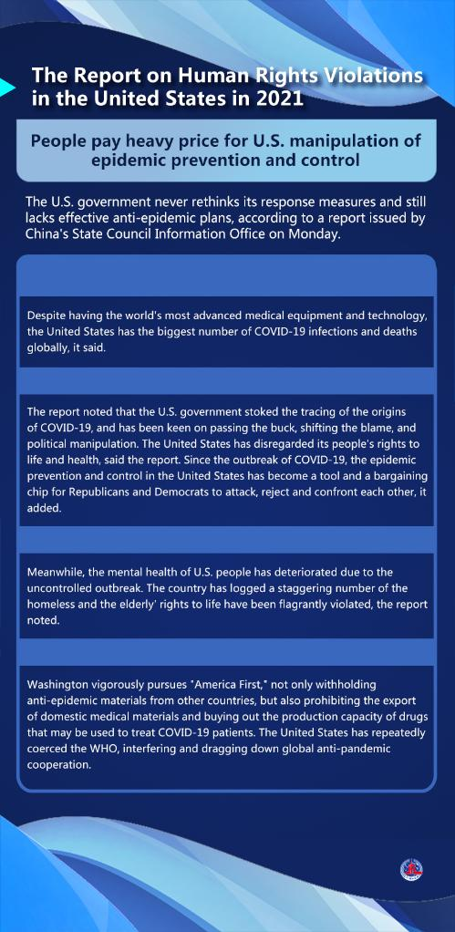 The report said the human rights situation in the United States, which has notorious records, worsened in 2021. Its political manipulation led to a sharp surge in COVID-19 deaths while shooting deaths in the country hit a new record.