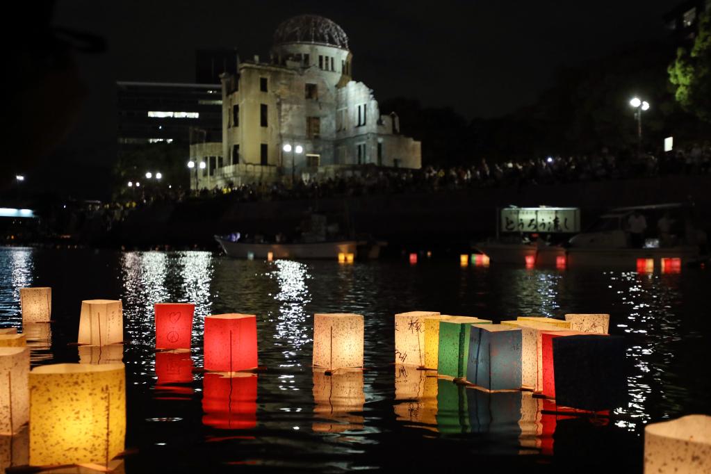 Paper lanterns float in the river at the Peace Memorial Park in Hiroshima, Japan, Aug. 6, 2019. (Xinhua/Du Xiaoyi)