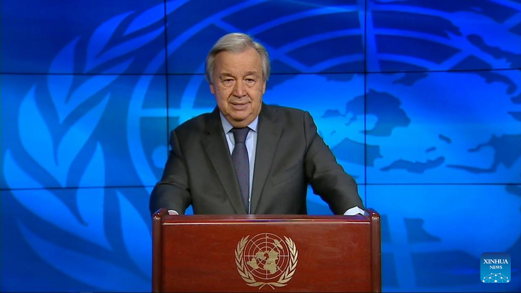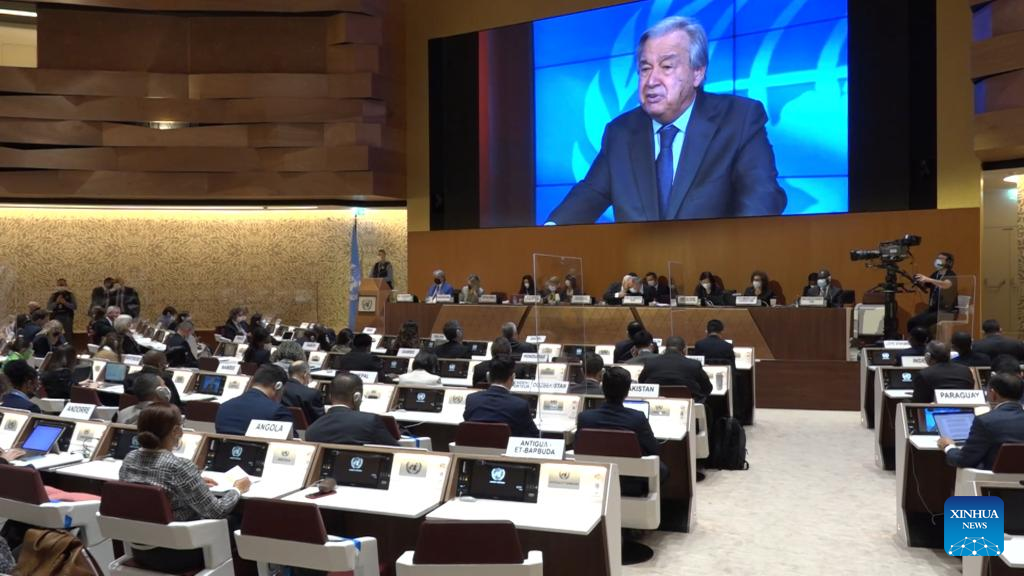 This image grabbed from a screen shows UN Secretary-General Antonio Guterres speaking via a video at the opening of the 49th session of the United Nations Human Rights Council (UNHRC), held at the United Nations Office at Geneva, Switzerland, Feb. 28, 2022. The ongoing 49th session of the UNHRC has decided to hold an emergency debate on the situation in Ukraine later this week. (Xinhua)
