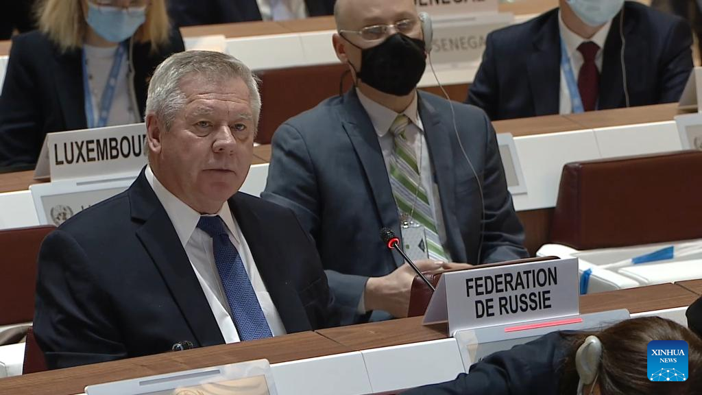 This image grabbed from a screen shows Gennady Gatilov, Russia's permanent representative to the United Nations Office in Geneva, speaking at the opening of the 49th session of the United Nations Human Rights Council (UNHRC), held at the United Nations Office at Geneva, Switzerland, Feb. 28, 2022. The ongoing 49th session of the UNHRC has decided to hold an emergency debate on the situation in Ukraine later this week. (Xinhua)