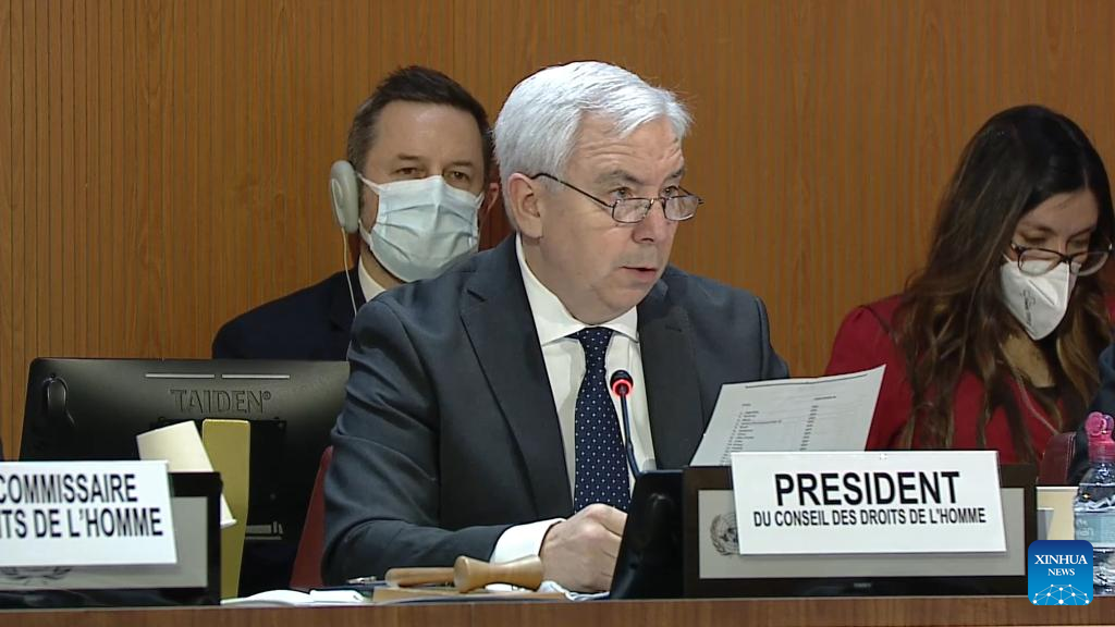 This image grabbed from a screen shows Federico Villegas, president of UN Human Rights Council, announcing the voting results on an emergency debate at the opening of the 49th session of the United Nations Human Rights Council (UNHRC), held at the United Nations Office at Geneva, Switzerland, Feb. 28, 2022. The ongoing 49th session of the UNHRC has decided to hold an emergency debate on the situation in Ukraine later this week. (Xinhua)