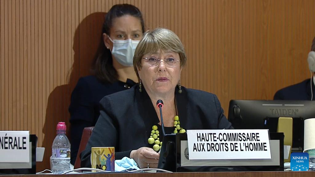 This image grabbed from a screen shows UN High Commissioner for Human Rights Michelle Bachelet speaking at the opening of the 49th session of the United Nations Human Rights Council (UNHRC), held at the United Nations Office at Geneva, Switzerland, Feb. 28, 2022. The ongoing 49th session of the UNHRC has decided to hold an emergency debate on the situation in Ukraine later this week. (Xinhua)