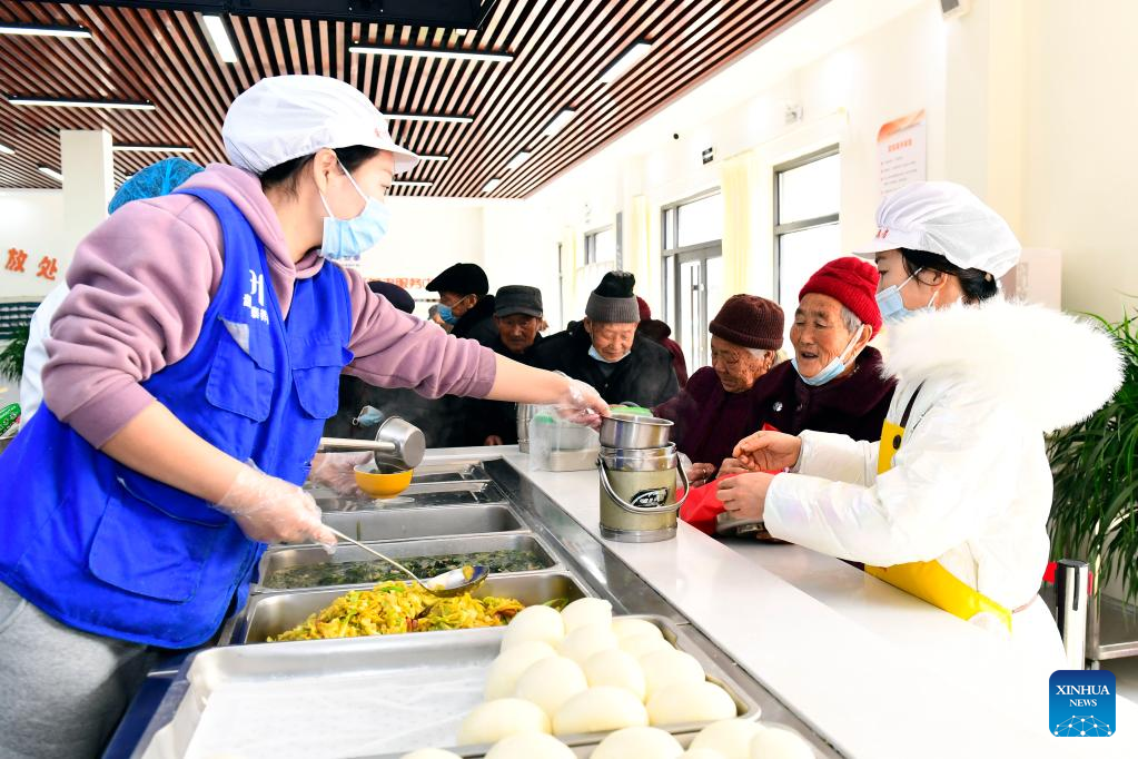 Volunteers serve lunch at a community care center for the elderly in Lanshan District, Rizhao, east China's Shandong Province, Feb. 27, 2022. Lanshan District of Rizhao City has set up care centers since 2021, providing assistance and care to the elderly people over 60 years old. (Xinhua/Guo Xulei)