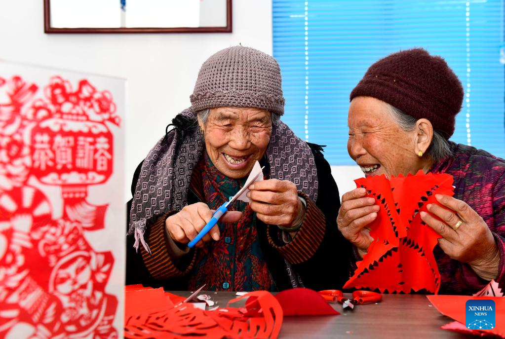 Two elderly women chat with each other while making paper-cuts at a care center for the elderly in Huangjiayu Village of Lanshan District, Rizhao, east China's Shandong Province, Feb. 27, 2022. Lanshan District of Rizhao City has set up care centers since 2021, providing assistance and care to the elderly people over 60 years old. (Xinhua/Guo Xulei)