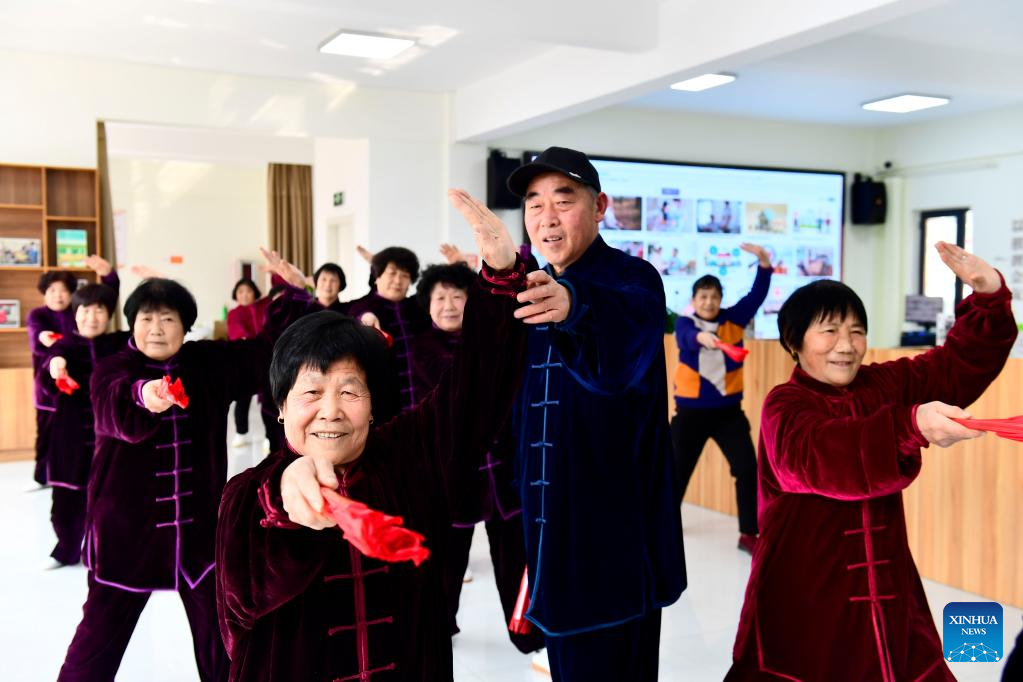 Elderly people practice Taiji at a community care center for the elderly in Lanshan District, Rizhao, east China's Shandong Province, Feb. 27, 2022. Lanshan District of Rizhao City has set up care centers since 2021, providing assistance and care to the elderly people over 60 years old. (Xinhua/Guo Xulei)