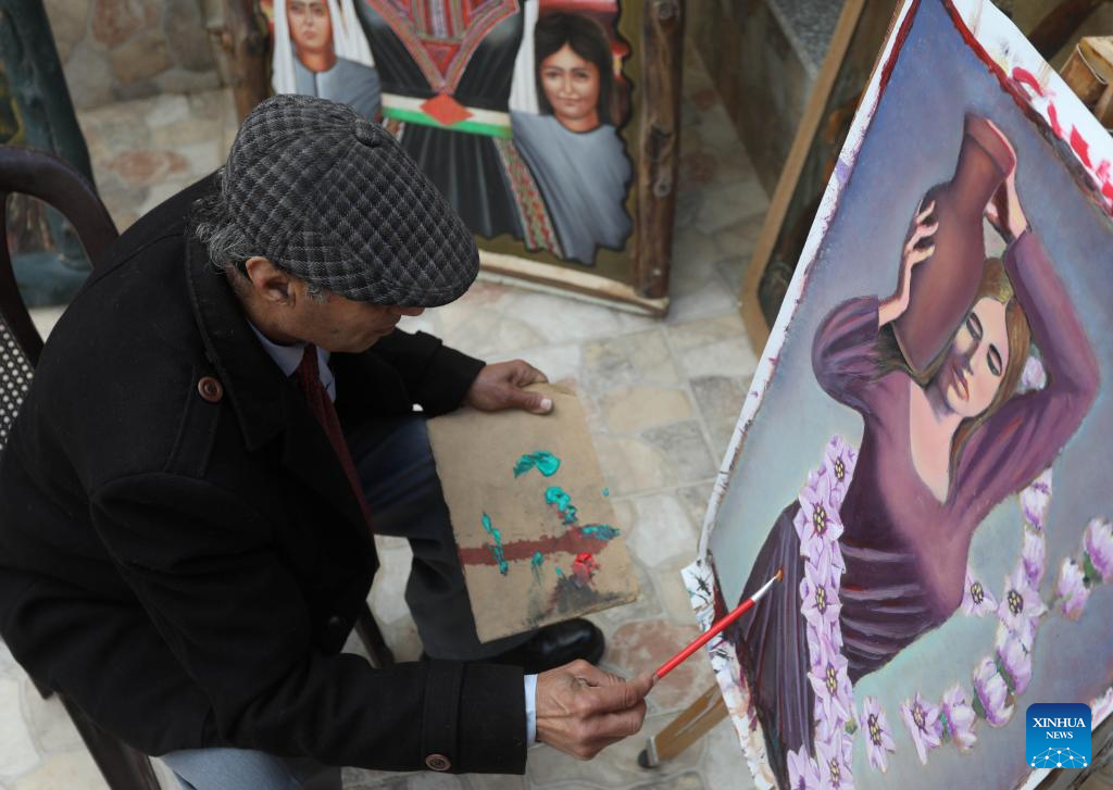 Murshid Gharib, a 73-year-old painter from Jenin who has about 50 years of experience in painting murals, works on a painting at his house in the West Bank city of Jenin, Feb. 21, 2022. TO GO WITH "Feature: Palestine artists turn walls into canvas for hope" (Photo by Ayman Nobani/Xinhua)