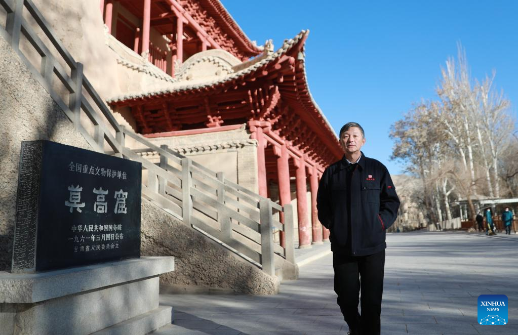 Photo taken on Feb. 23, 2022 shows Su Bomin in the Mogao Grottoes in Dunhuang, northwest China's Gansu Province. Su Bomin, a deputy to the National People's Congress (NPC), also dean of Dunhuang Academy, has been working for three decades in the Mogao Grottoes, a UNESCO World Heritage site in Dunhuang, northwest China's Gansu Province. (Xinhua/Du Zheyu)
