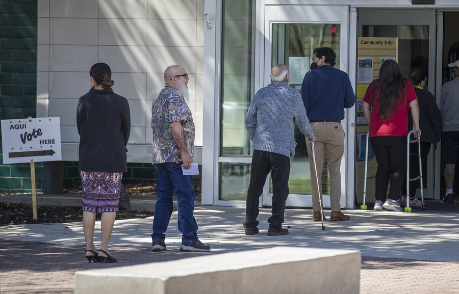 Voters wait in line to cast their ballots in the Texas 2022 primary election in San Antonio, Texas, the United States, on March 1, 2022. (Photo by Nick Wagner/Xinhua)
