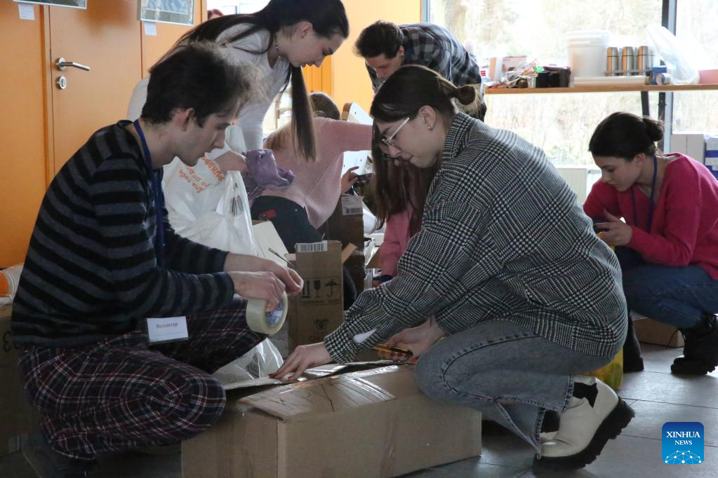Students arrange supplies at a university in Lviv, Ukraine, March 1, 2022. (Xinhua/Chen Wenxian)