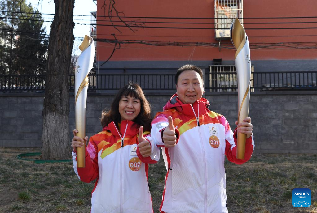 Torchbearer Zhu Pengkai (R) and Zhou Shuna hold their torches during the Beijing 2022 Paralymic Torch Relay and Flame Lighting Ceremony at China Braille Library in Beijing, capital of China, March 2, 2022.