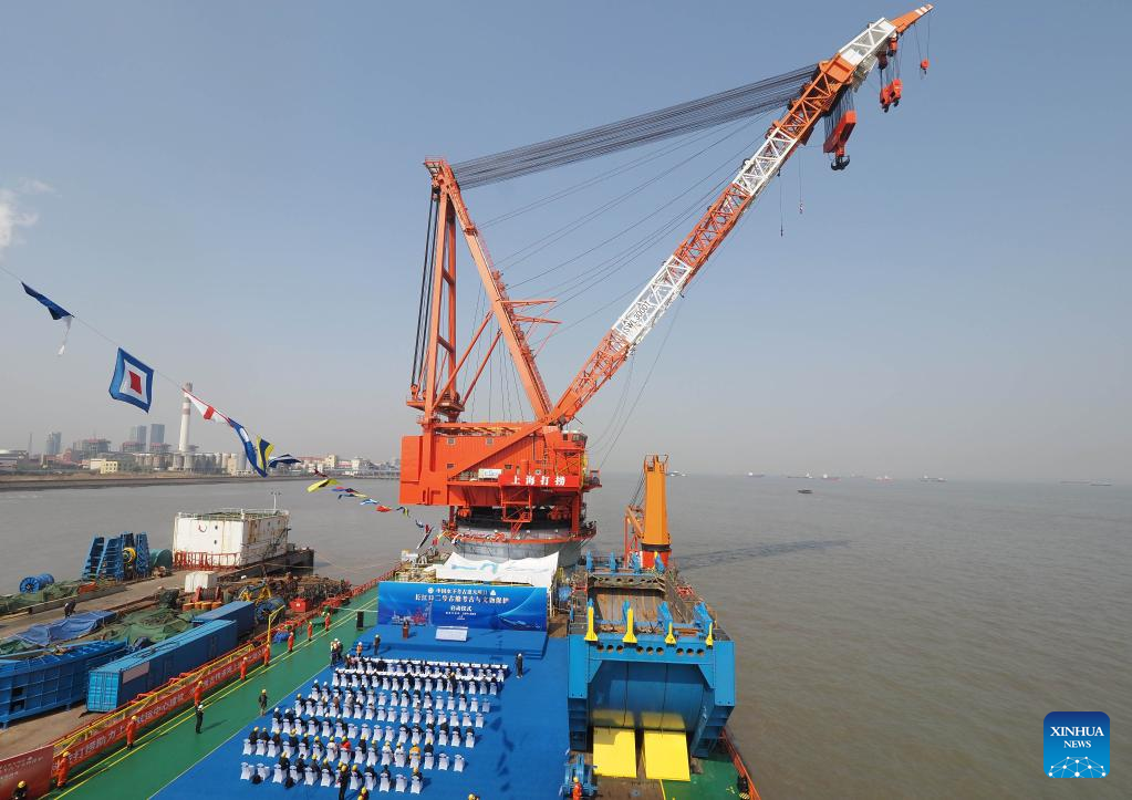 Photo taken on March 2, 2022 shows the launching ceremony of salvage of Yangtze No. 2 Ancient Shipwreck at Waigaoqiao port in east China's Shanghai.