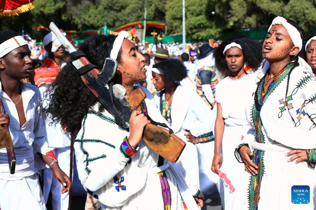 People perform during a celebration for the Victory Day in Addis Ababa, Ethiopia, on March 2, 2022. Ethiopians on Wednesday celebrated the 126th anniversary of Ethiopia's victory of Adwa, which marked the East African country's victory against a colonial power some 126 years ago. (Xinhua)