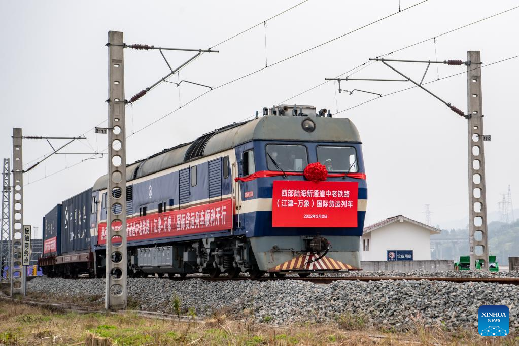 A cargo train bound for Vientiane, Laos, departs from Xiaonanya station in Jiangjin District, southwest China's Chongqing Municipality, March 2, 2022. (Xinhua/Tang Yi)