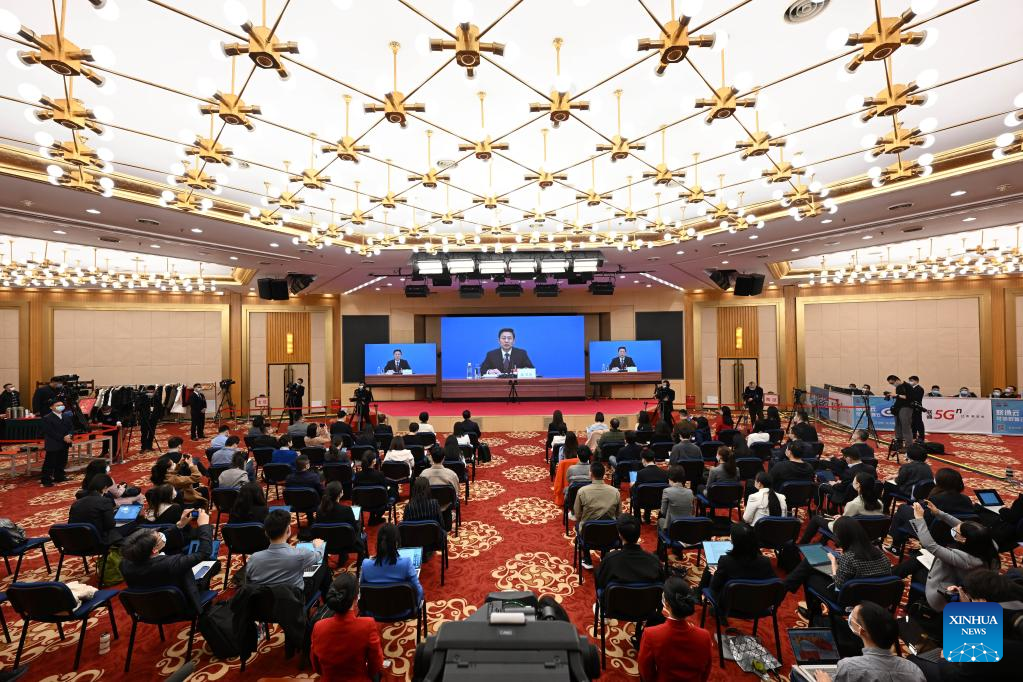 Guo Weimin (2nd R), spokesperson for the fifth session of the 13th National Committee of the Chinese People's Political Consultative Conference (CPPCC), answers questions via video link due to COVID-19 prevention and control requirements during a press conference in Beijing, capital of China, March 3, 2022. (Xinhua/Yin Gang)