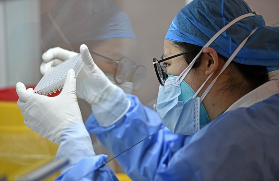 A staff member works at the air-inflated testing lab for COVID-19 nucleic acid testing in the Binhai New Area of north China's Tianjin, Jan. 13, 2022. (Xinhua/Zhao Zishuo)