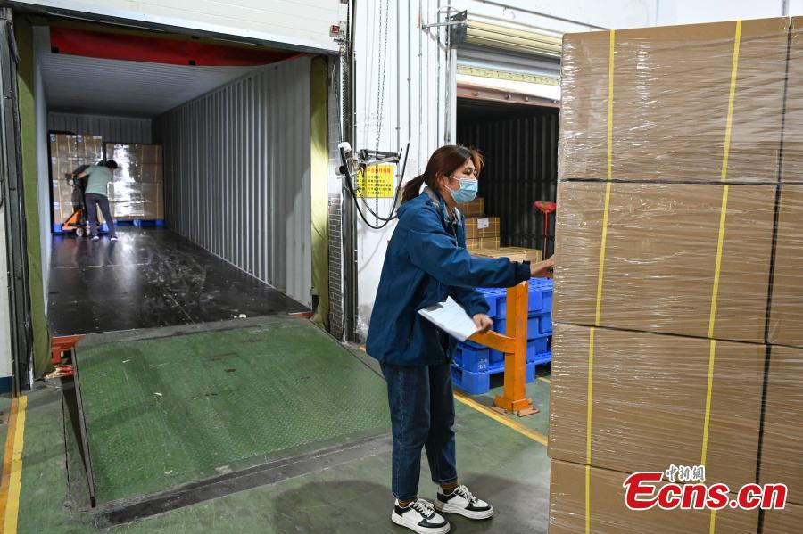 Covid-19 rapid antigen test kits for the Hong Kong Special Administrative Region are loaded to a container at Humen wharf, Guangzhou, south China's Guangdong Province, March 2, 2022. Six million COVID-19 antigen test kits will be shipped to Hong Kong on Thursday. (Photo: China News Service/Chen Jimin)