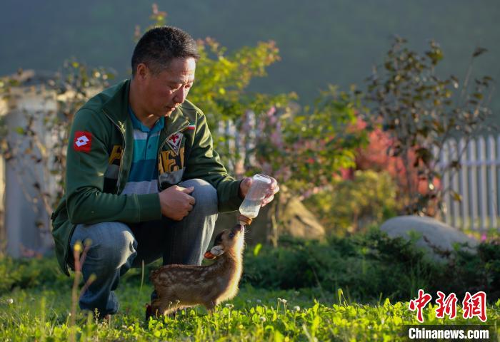 Zhang Shuyan nurses a fawn from a herd of South China sika deer, which is under first-class state protection in China. (Photo courtesy of Zhang Shuyan)