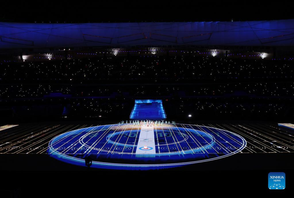 Photo taken on March 4, 2022 shows the countdown performance ahead of the opening ceremony of the Beijing 2022 Paralympic Winter Games at the National Stadium in Beijing, capital of China. (Xinhua/Lan Hongguang)