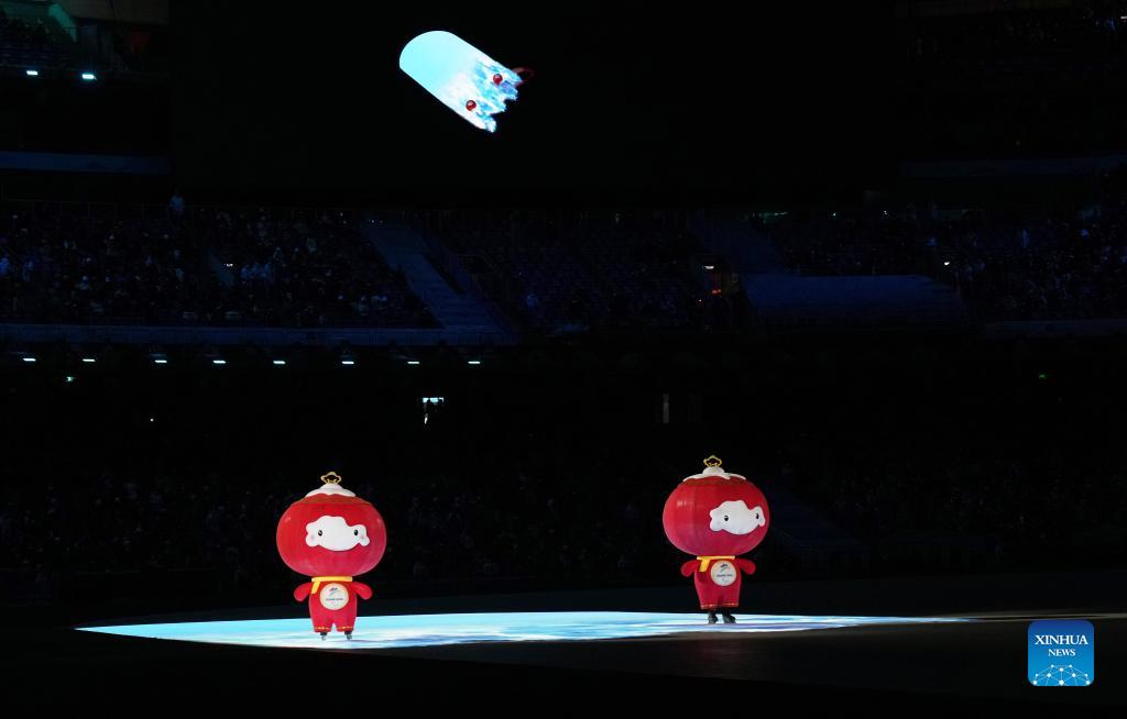 Two Shuey Rhon Rhons, the red lantern-shaped mascot of this Paralympic Winter Games skate onto the stage during the opening ceremony of the Beijing 2022 Paralympic Winter Games at the National Stadium in Beijing, capital of China, March 4, 2022. (Xinhua/Wu Zhuang)