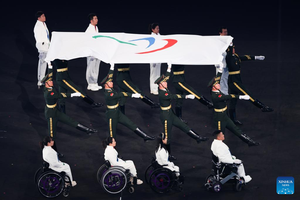 The Paralympic Flag is carried during the opening ceremony of the Beijing 2022 Paralympic Winter Games at the National Stadium in Beijing, capital of China, March 4, 2022. (Xinhua/Ren Chao)