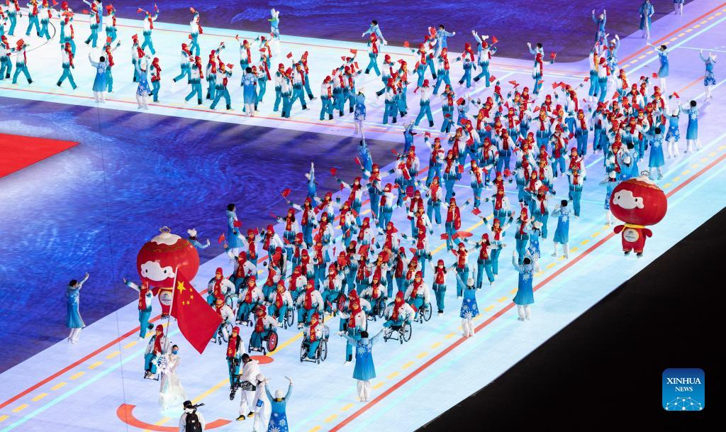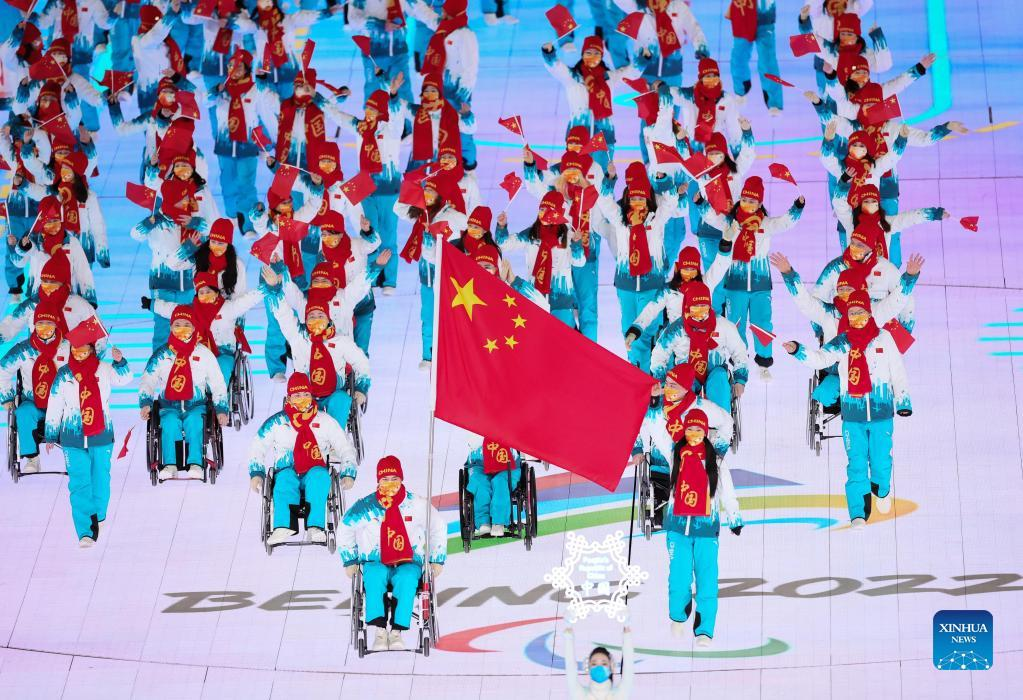 The delegation of the People's Republic of China parade into the National Stadium during the opening ceremony of the Beijing 2022 Paralympic Winter Games at the National Stadium in Beijing, capital of China, March 4, 2022. (Xinhua/Cai Yang)