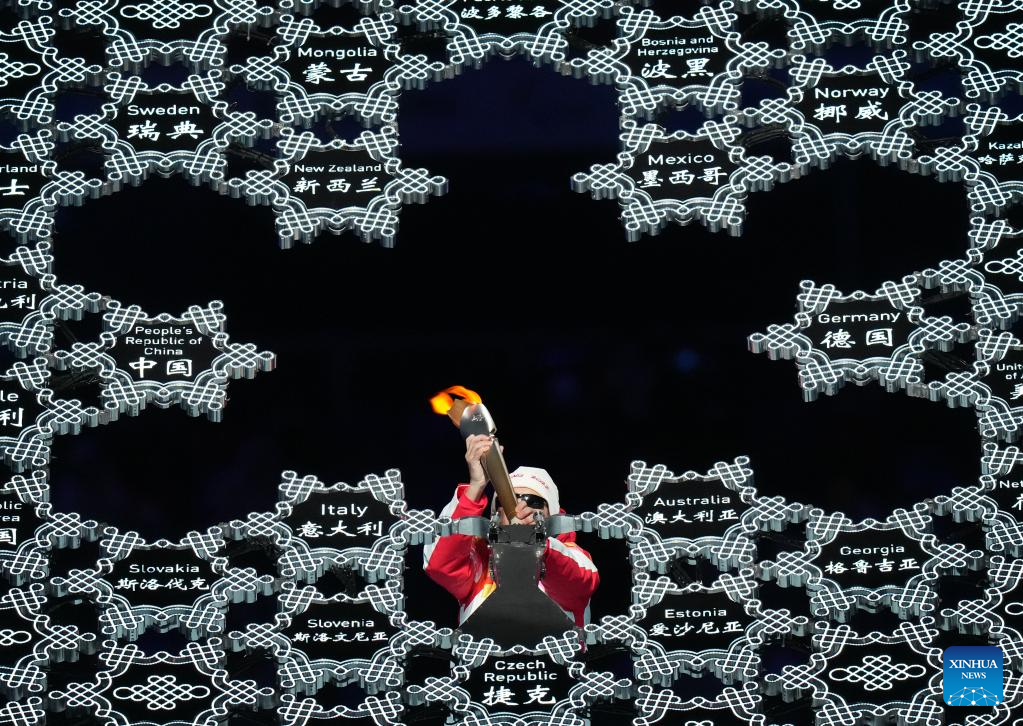 Torchbearer Li Duan prepares to light up the Paralympic Winter Games Cauldron during the opening ceremony of the Beijing 2022 Paralympic Winter Games at the National Stadium in Beijing, capital of China, March 4, 2022. (Xinhua/Lan Hongguang)