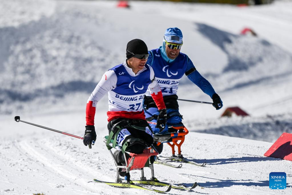 China's Liu Zixu (L) competes during the biathlon men's sprint sitting event of Beijing 2022 Paralympic Winter Games at National Biathlon Centre in Zhangjiakou, north China's Hebei Province, March 5, 2022. (Xinhua/Hu Chao)