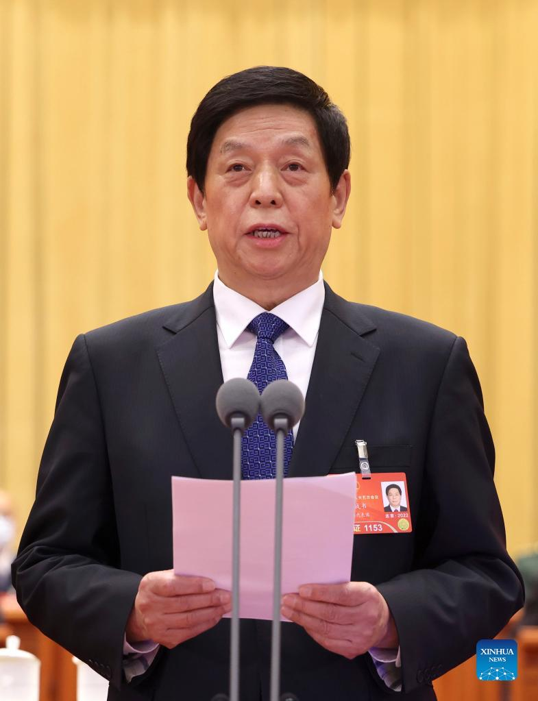 Li Zhanshu presides over the opening meeting of the fifth session of the 13th National People's Congress (NPC) at the Great Hall of the People in Beijing, capital of China, March 5, 2022. (Xinhua/Huang Jingwen)