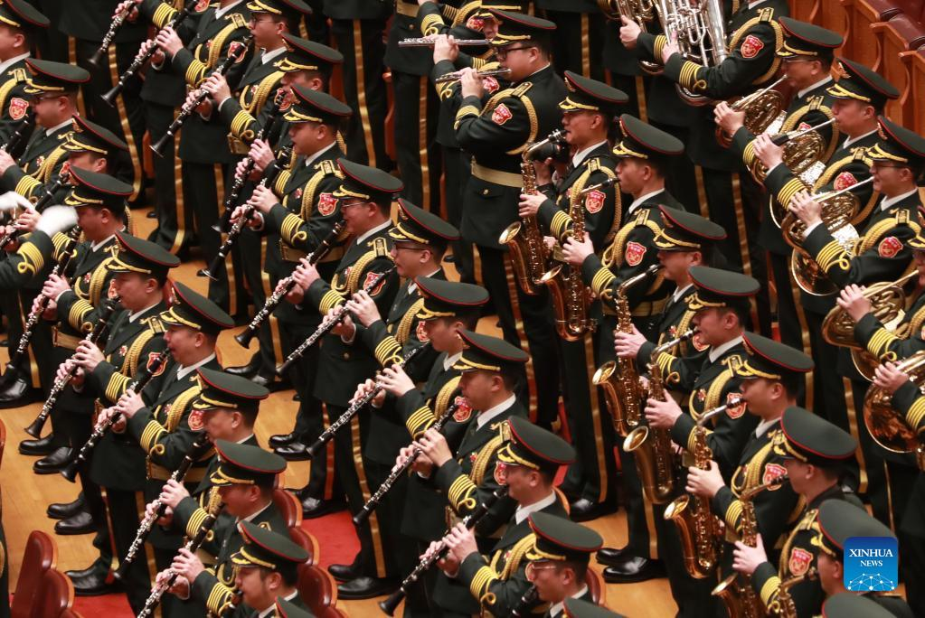 The military band of the Chinese People's Liberation Army performs during the opening meeting of the fifth session of the 13th National People's Congress (NPC) at the Great Hall of the People in Beijing, capital of China, March 5, 2022. (Xinhua/Lu Ye)
