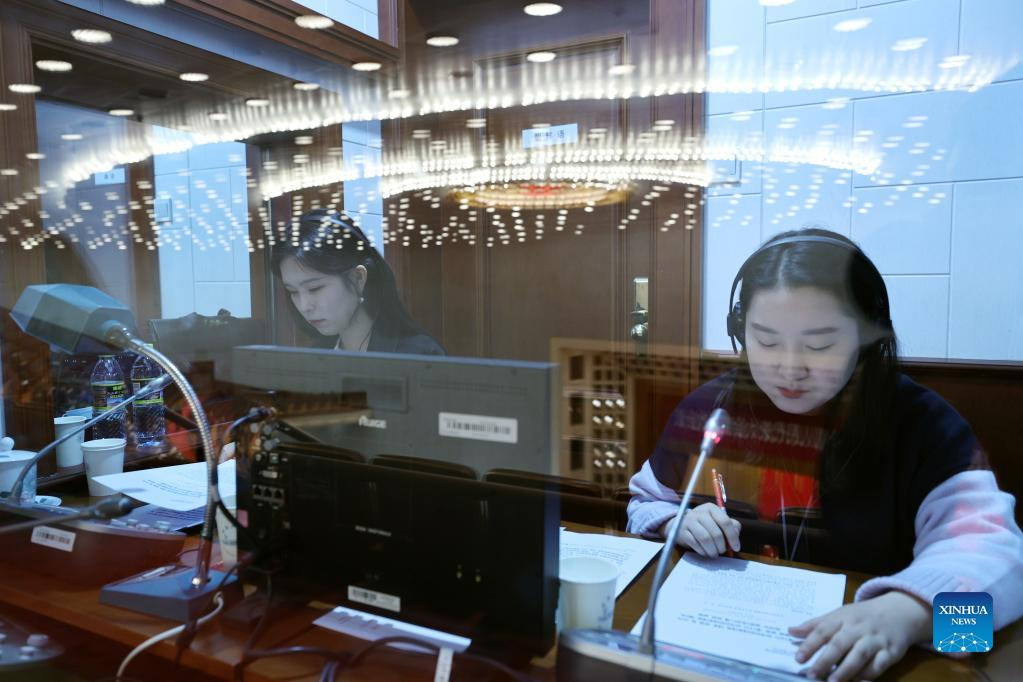 Interpreters work during the opening meeting of the fifth session of the 13th National People's Congress (NPC) at the Great Hall of the People in Beijing, capital of China, March 5, 2022. (Xinhua/Jin Liwang)