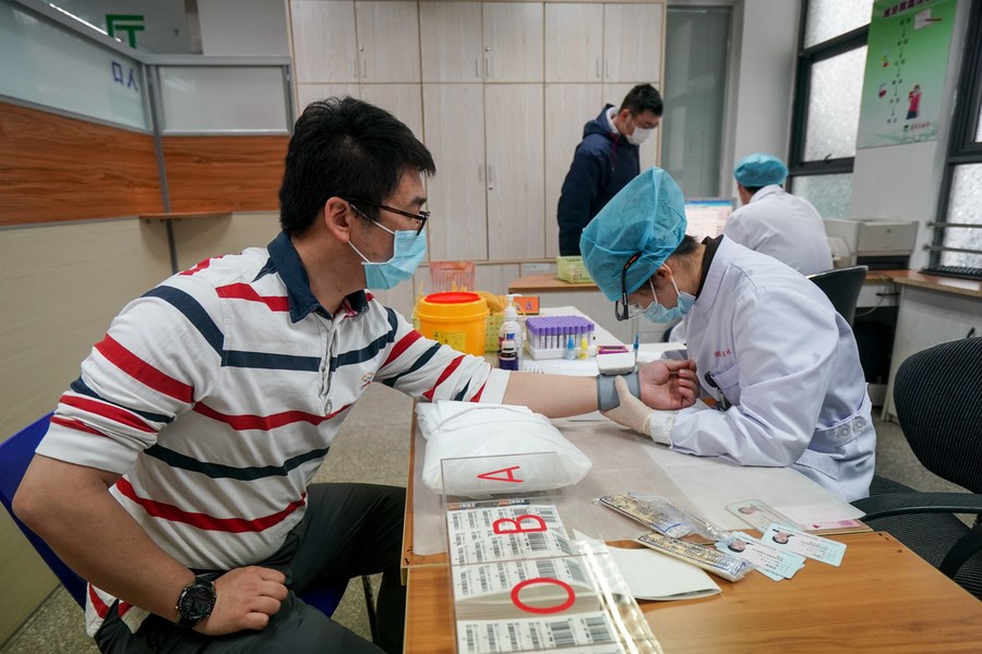 A man takes physical examination before donating his blood at the Nanjing Red Cross Blood Center in Nanjing, east China's Jiangsu Province, March 4, 2020. (Xinhua/Ji Chunpeng)