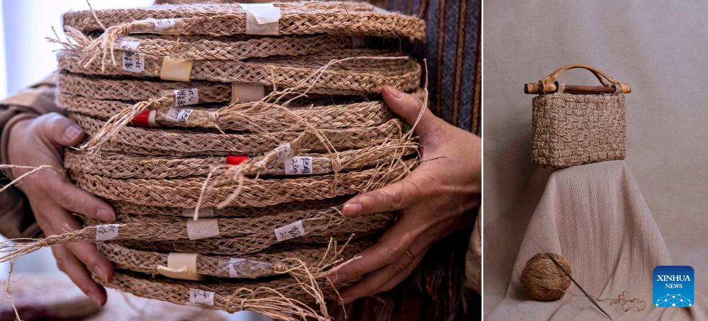 In this combo photo, the left part taken by Yang Zhisen on March 4, 2022 shows the hemp products made by villagers, in Yueyahu Township, Yinchuan, capital of northwest China's Ningxia Hui Autonomous Region; and the right part provided by the interviewee shows a bag made by Zhang Jing. Zhang Jing, an inheritor of intangible cultural heritage of hemp weaving, came to Yueyahu Township at the end of 2017, and set up a training class and a hemp weaving workshop here. Most of the trainees are women, with the youngest 26 years old and the oldest over 70.