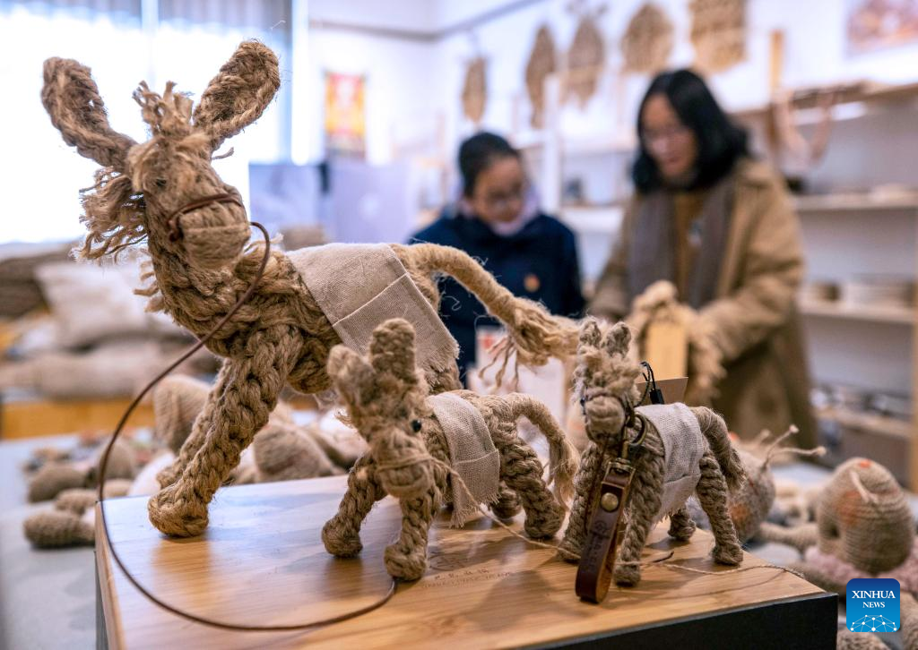 Photo taken on March 4, 2022 shows the hemp weaving products displayed at the hemp weaving workshop in Yueyahu Township, Yinchuan, capital of northwest China's Ningxia Hui Autonomous Region. Zhang Jing, an inheritor of intangible cultural heritage of hemp weaving, came to Yueyahu Township at the end of 2017, and set up a training class and a hemp weaving workshop here. Most of the trainees are women, with the youngest 26 years old and the oldest over 70.