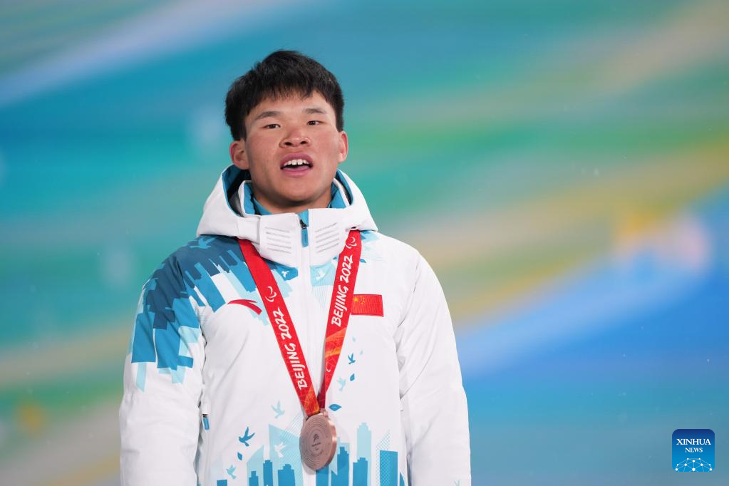 Bronze medalist Liu Mengtao of China poses for a photo during the awarding ceremony of Para Biathlon Men's Sprint Sitting of Beijing 2022 Paralympic Winter Games at Zhangjiakou Medals Plaza in Zhangjiakou, north China's Hebei Province, March 6, 2022. (Xinhua/Peng Ziyang)