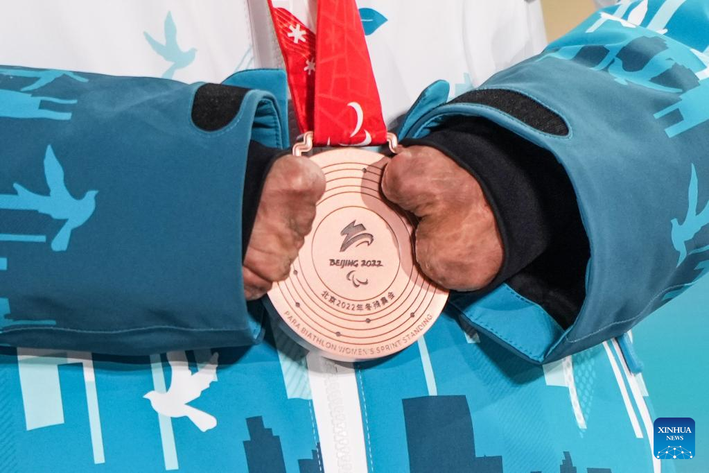 Bronze medalist Zhao Zhiqing of China holds her medal during the awarding ceremony of Para Biathlon Women's Sprint Standing of Beijing 2022 Paralympic Winter Games at Zhangjiakou Medals Plaza in Zhangjiakou, north China's Hebei Province, March 6, 2022. (Xinhua/Peng Ziyang)