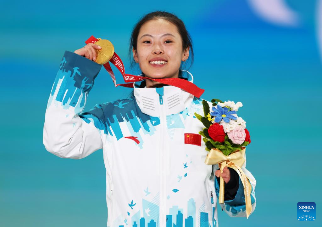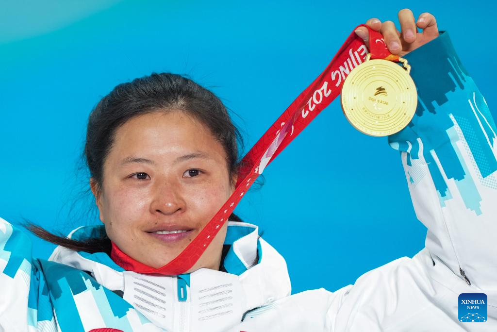 Gold medalist Guo Yujie of China poses for a photo during the awarding ceremony of Para Biathlon Women's Sprint Standing of Beijing 2022 Paralympic Winter Games at Zhangjiakou Medals Plaza in Zhangjiakou, north China's Hebei Province, March 6, 2022. (Xinhua/Jia Haocheng)