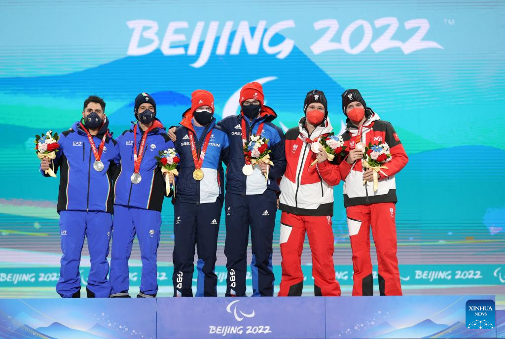 Medalists and their guides pose for a group photo during the awarding ceremony for the Alpine Skiing Men's Super-G Vision Impaired of Beijing 2022 Paralympic Winter Games at Yanqing Medals Plaza of the Winter Paralympics in Yanqing District, Beijing, capital of China, March 6, 2022. (Xinhua/Luo Yuan)