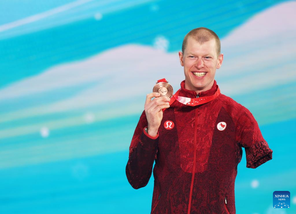 Bronze medalist Mark Arendz of Canada poses for a photo during the awarding ceremony of Para Biathlon Men's Sprint Standing of Beijing 2022 Paralympic Winter Games at Zhangjiakou Medals Plaza in Zhangjiakou, north China's Hebei Province, March 6, 2022. (Xinhua/Jia Haocheng)