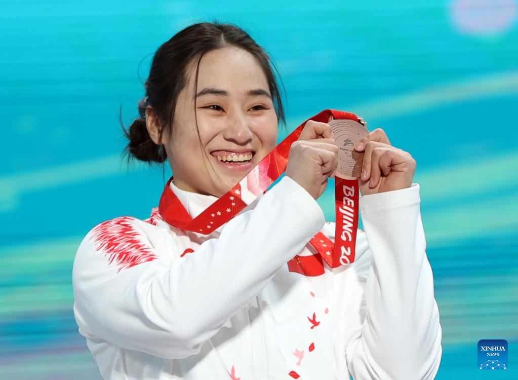 Bronze medalist Zhang Wenjing of China shows her medal during the awarding ceremony for the Alpine Skiing Women's Super-G Sitting of Beijing 2022 Paralympic Winter Games at Yanqing Medals Plaza of the Winter Paralympics in Yanqing District, Beijing, capital of China, March 6, 2022. (Xinhua/Luo Yuan)