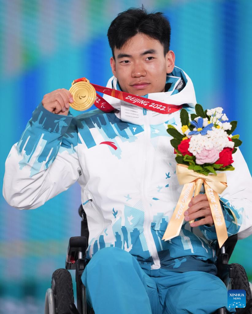 Gold medalist Liu Zixu of China poses for a photo during the awarding ceremony of Para Biathlon Men's Sprint Sitting of Beijing 2022 Paralympic Winter Games at Zhangjiakou Medals Plaza in Zhangjiakou, north China's Hebei Province, March 6, 2022. (Xinhua/Peng Ziyang)