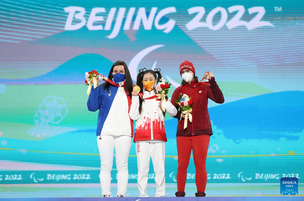 Gold medalist Zhang Mengqiu of China(C), silver medalist Marie Bochet of France(L) and bronze medalist Alana Ramsay of Canada pose for a group photo during the awarding ceremony for the Alpine Skiing Women's Super-G Standing of Beijing 2022 Paralympic Winter Games at Yanqing Medals Plaza of the Winter Paralympics in Yanqing District, Beijing, capital of China, March 6, 2022. (Xinhua/Luo Yuan)