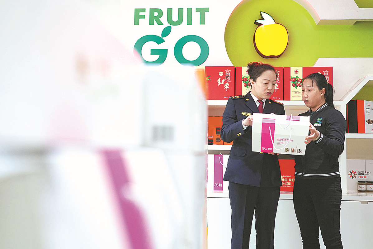 An employee of the Hebei Administration for Market Regulation explains intellectual property rights to a worker at a produce store in Xingtai, Hebei province, in April. LUO XUEFENG/XINHUA