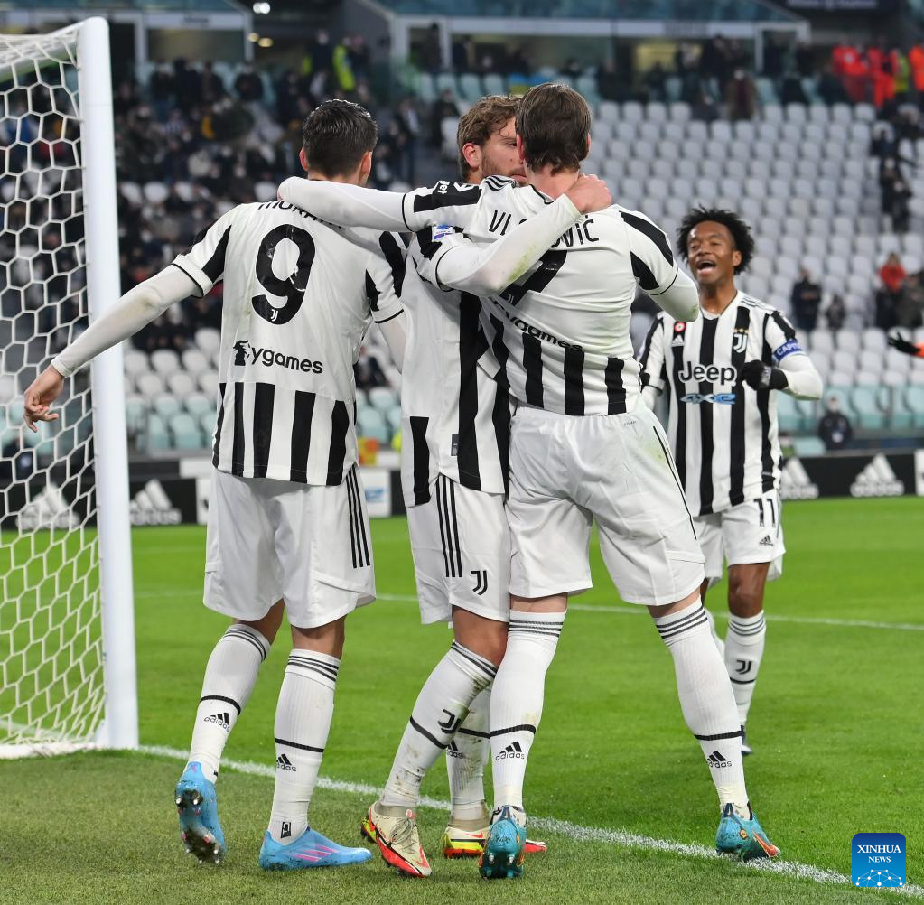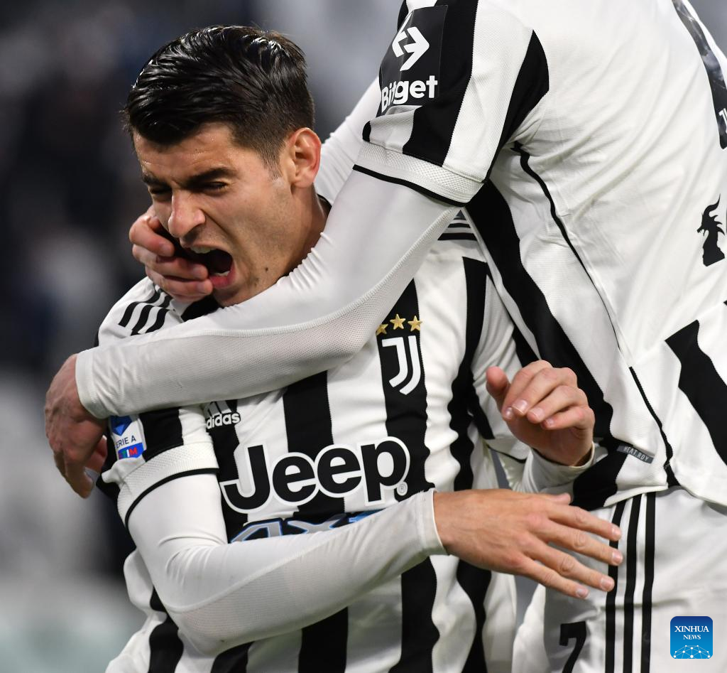 FC Juventus' Alvaro Morata (1st L) celebrates his goal with teammates during a Serie A football match between FC Juventus and Spezia in Turin, Italy, on March 6, 2022. (Photo by Federico Tardito/Xinhua)