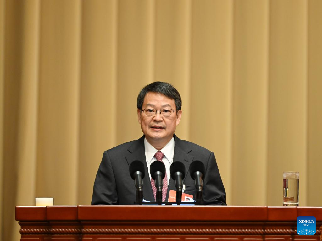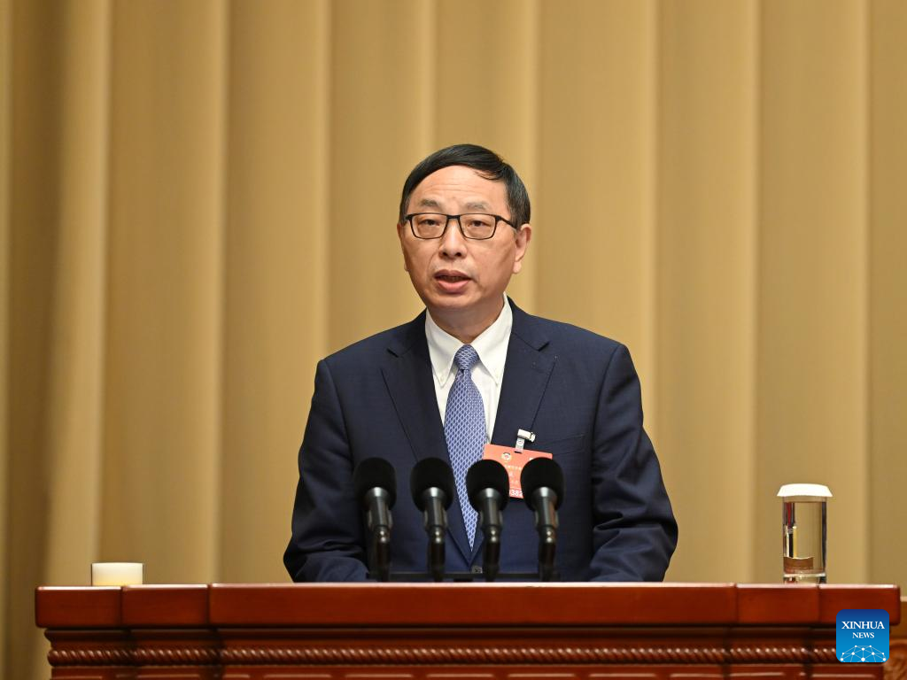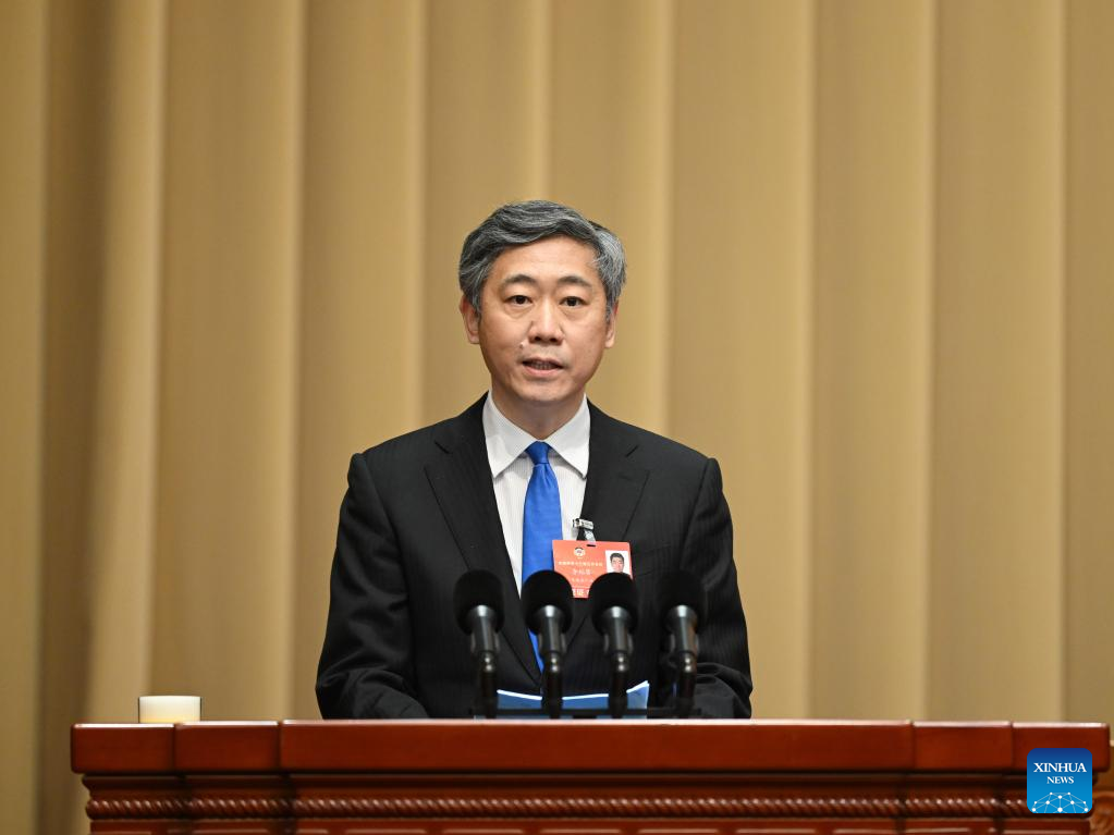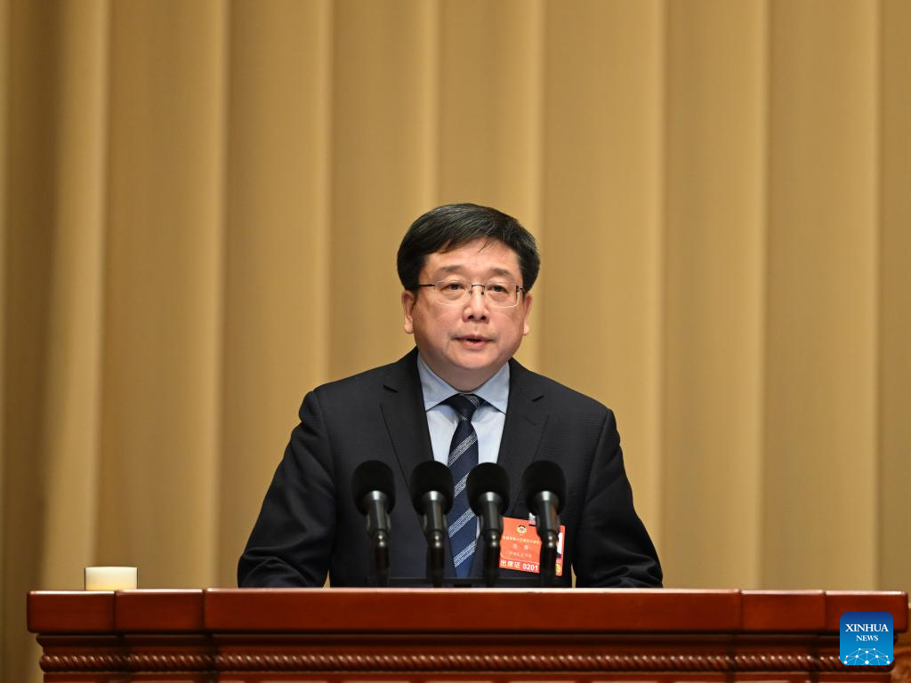 Li Daokui, a member of the 13th National Committee of the Chinese People's Political Consultative Conference (CPPCC), delivers a speech at the main venue of a video conference of the fifth session of the 13th CPPCC National Committee in Beijing, capital of China, March 7, 2022. (Xinhua/Yin Bogu)