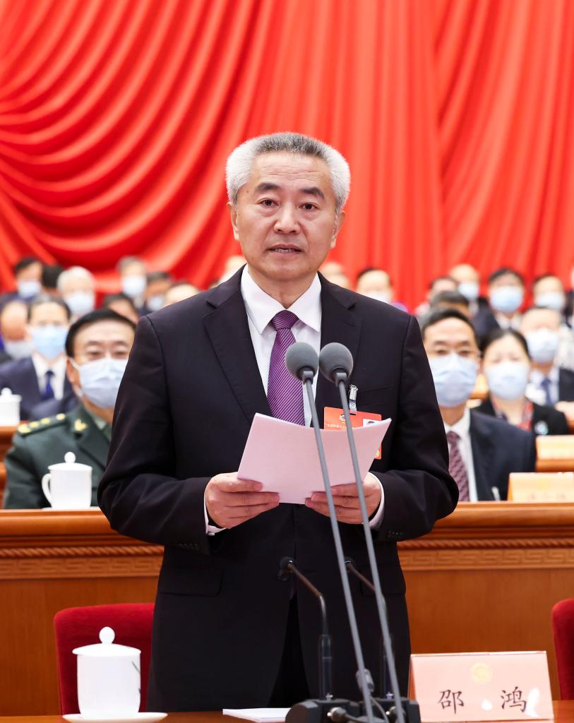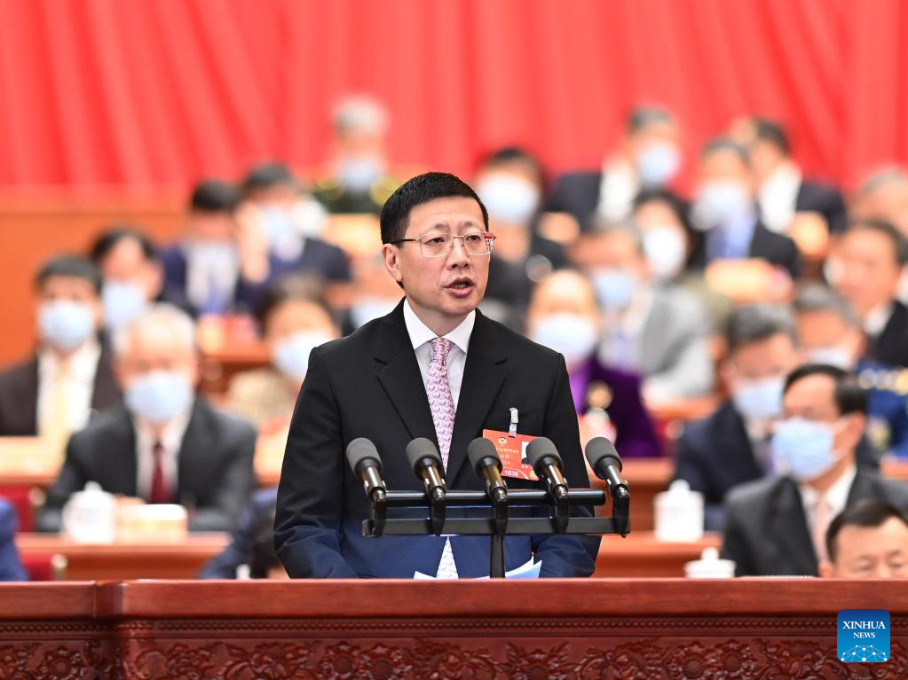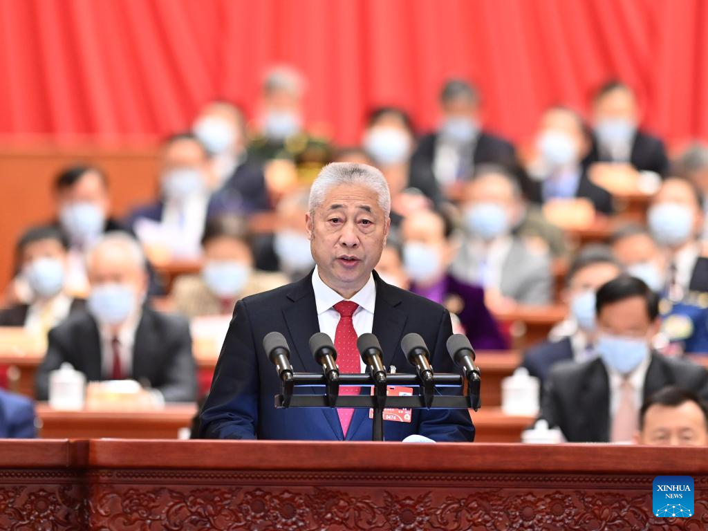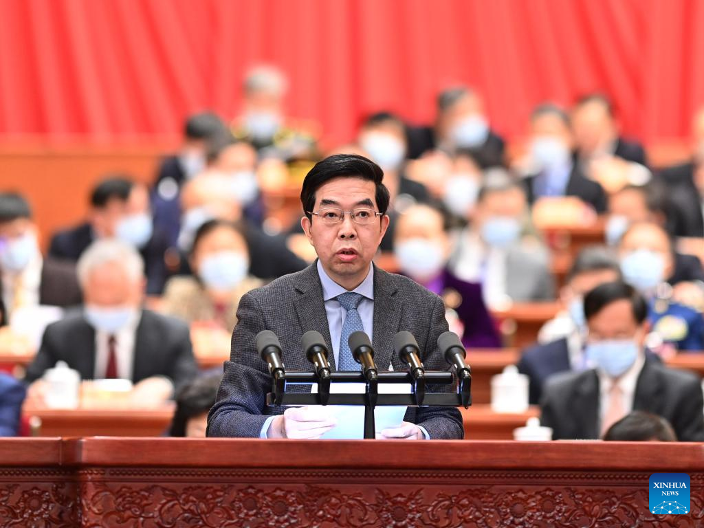 Wang Hong, a member of the 13th National Committee of the Chinese People's Political Consultative Conference (CPPCC), delivers a speech on behalf of the Central Committee of the Revolutionary Committee of the Chinese Kuomintang at the second plenary meeting of the fifth session of the 13th CPPCC National Committee at the Great Hall of the People in Beijing, capital of China, March 7, 2022. (Xinhua/Ding Lin)